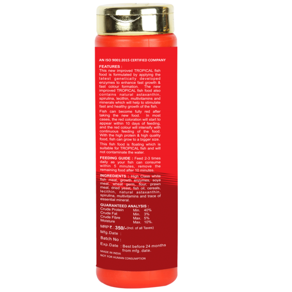 This new improved TROPICAL fish food is formulated by applying the latest genetically developed enzymes to enhance fast growth & fast colour formation. The TROPICAL fish food also contains natural Astaxanthin, Spirulina, Lecithin, Multivitamins and Minerals which will help to stimulate fast and healthy growth of the fish.